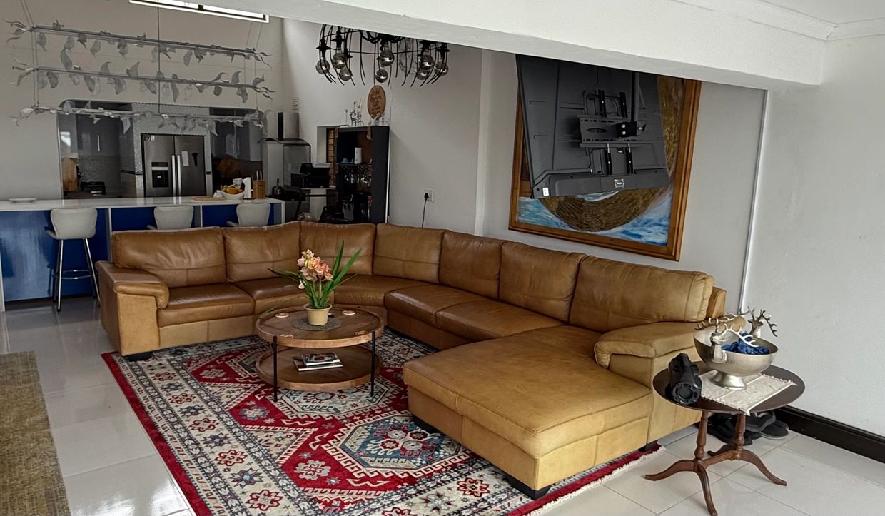 This inviting living space combines warmth and sophistication with modern comfort. A generous leather sectional anchors the room, offering plenty of seating for family gatherings or quiet evenings in. Natural light filters through large windows, highlighting the statement chandelier and a striking piece of contemporary artwork that adds character and depth. A layered coffee table with fresh blooms creates a welcoming centerpiece, while the mounted flat-screen TV ensures entertainment is always within reach. Cozy yet stylish, it’s a space designed for both conversation and relaxation.